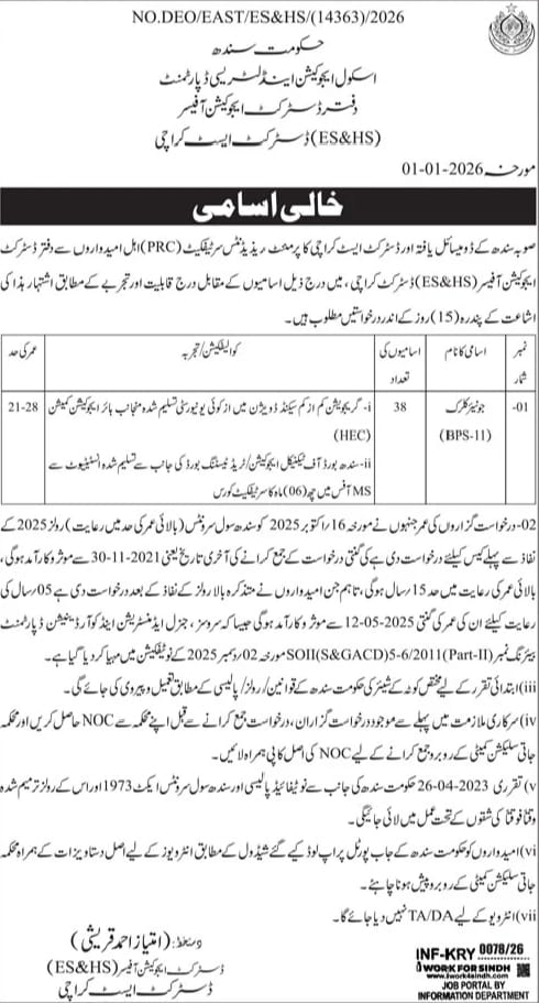 The School Education & Literacy Department, Government of Sindh, has announced new vacancies for Junior Clerk (BPS-11) in the District Education Office (ES&HS), Karachi East. Eligible candidates who are permanent residents of Karachi East are invited to apply.
