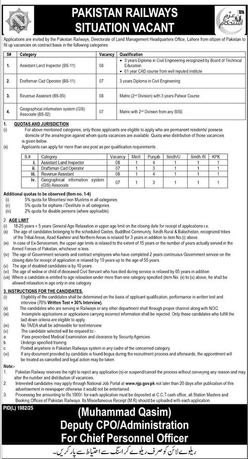 Pakistan Railways, through the Directorate of Land & Management (Headquarters Office), invites applications from eligible individuals of all genders across Pakistan for contract-based government positions. Applications must be submitted online through the National Job Portal (NJP) within the announced timeframe.