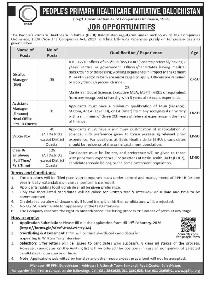 The People’s Primary Healthcare Initiatives (PPHI) Balochistan is inviting applications for multiple positions across the province. These roles are offered on a temporary basis under Section 42 of the Companies Act, 2017.