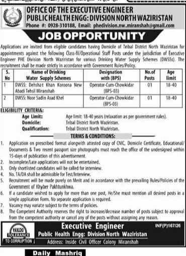 The Office of the Executive Engineer, Public Health Engineering (PHE) Division North Waziristan has announced Class-IV / Operational Staff job opportunities for eligible candidates having domicile of Tribal District North Waziristan. Recruitment will be carried out strictly according to Government of Khyber Pakhtunkhwa rules and policies.
